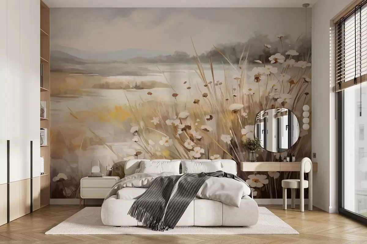 Fototapeten Feld mit hohem Gras und weißen Gänseblümchen, Bäume im Hintergrund, unter einem bewölkten Himmel, strukturierte Landschaft, weiche Pinselstriche N° w09139