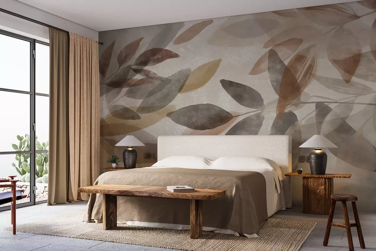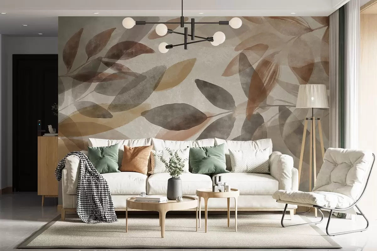 Fototapeten Abstrakte strukturierte Blätter in gedämpften Braun-, Beige- und Grautönen, transparente Formen, minimalistischer Stil, organische Formen N° w09140