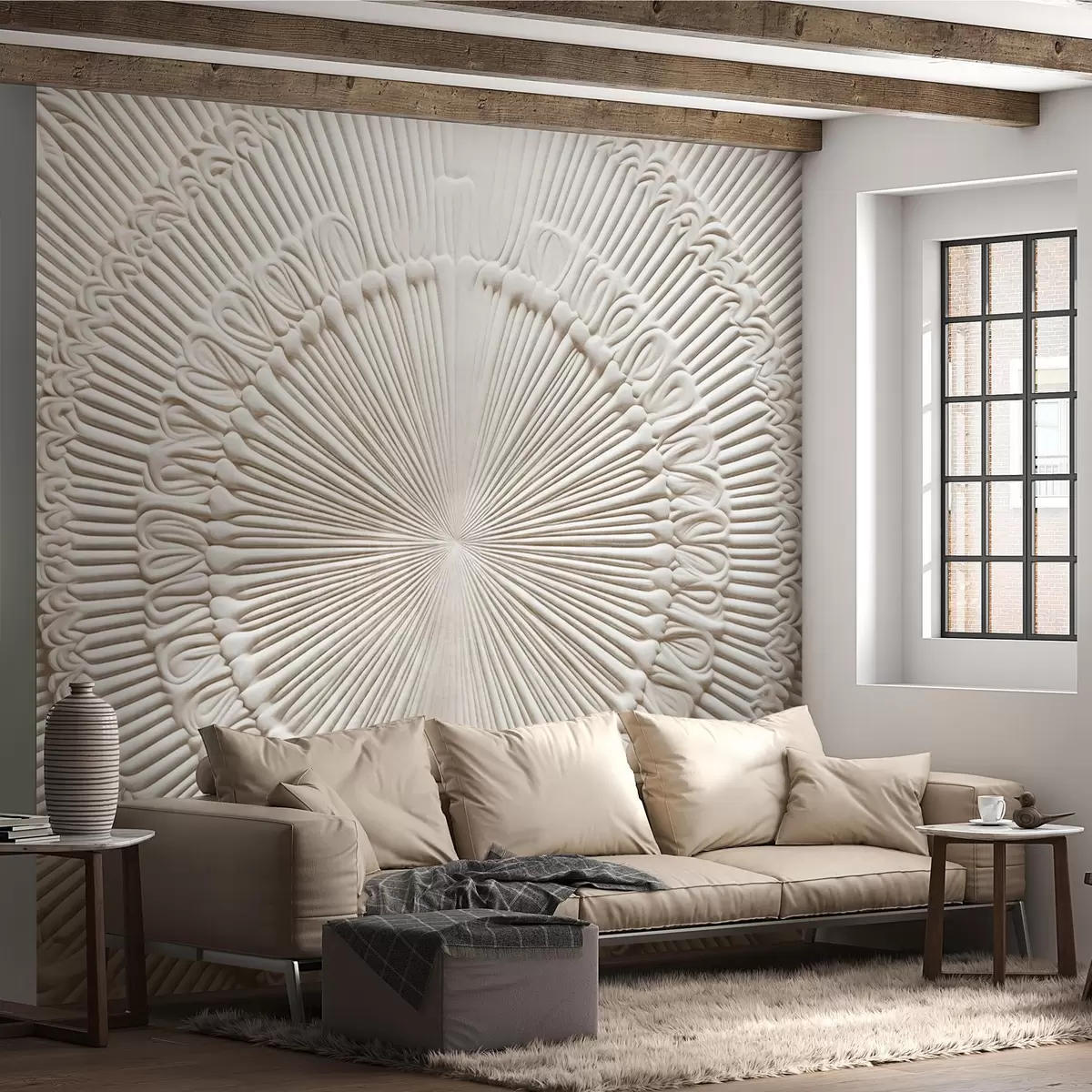 Fototapeten Abstrakter strukturierter Runddruck mit radialen Linien und dekorativen Elementen, symmetrisches Design, Reliefstruktur N° w09154