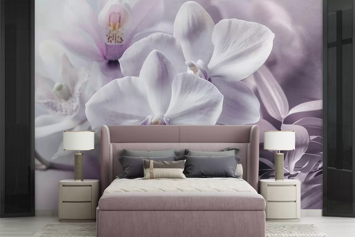Fototapeten Weiße und lilafarbene zarte Orchideenblüten, weiche Beleuchtung und ein verschwommener, strukturierter Hintergrund N° w09155
