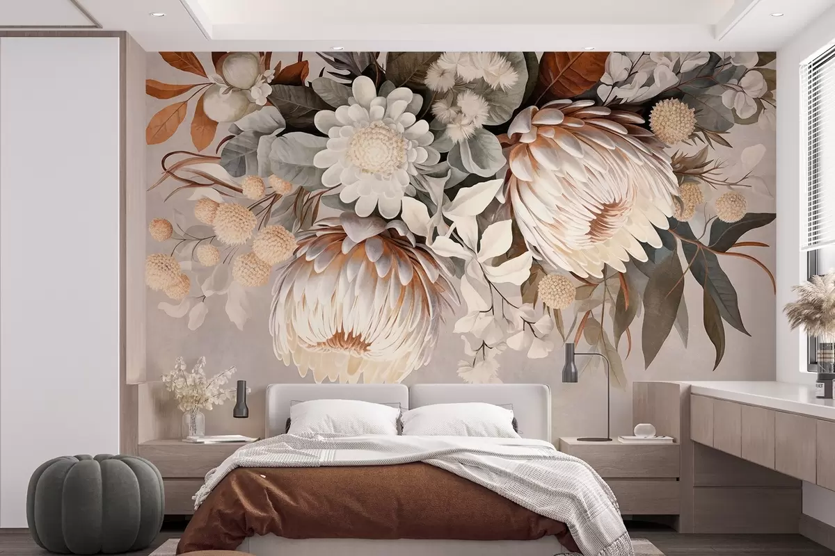 Fototapeten Große, strukturierte Protea mit braunen Akzenten, weißen Gänseblümchen und gelben Blüten, beigefarbener, gedämpfter Hintergrund N° w09157