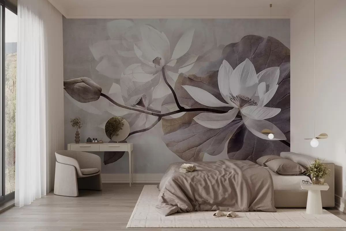 Fototapeten Körnig strukturierte, gedämpfte, zarte Lotosblumen mit Blättern und Stängeln in einer weichen, beigen Farbpalette N° w09159