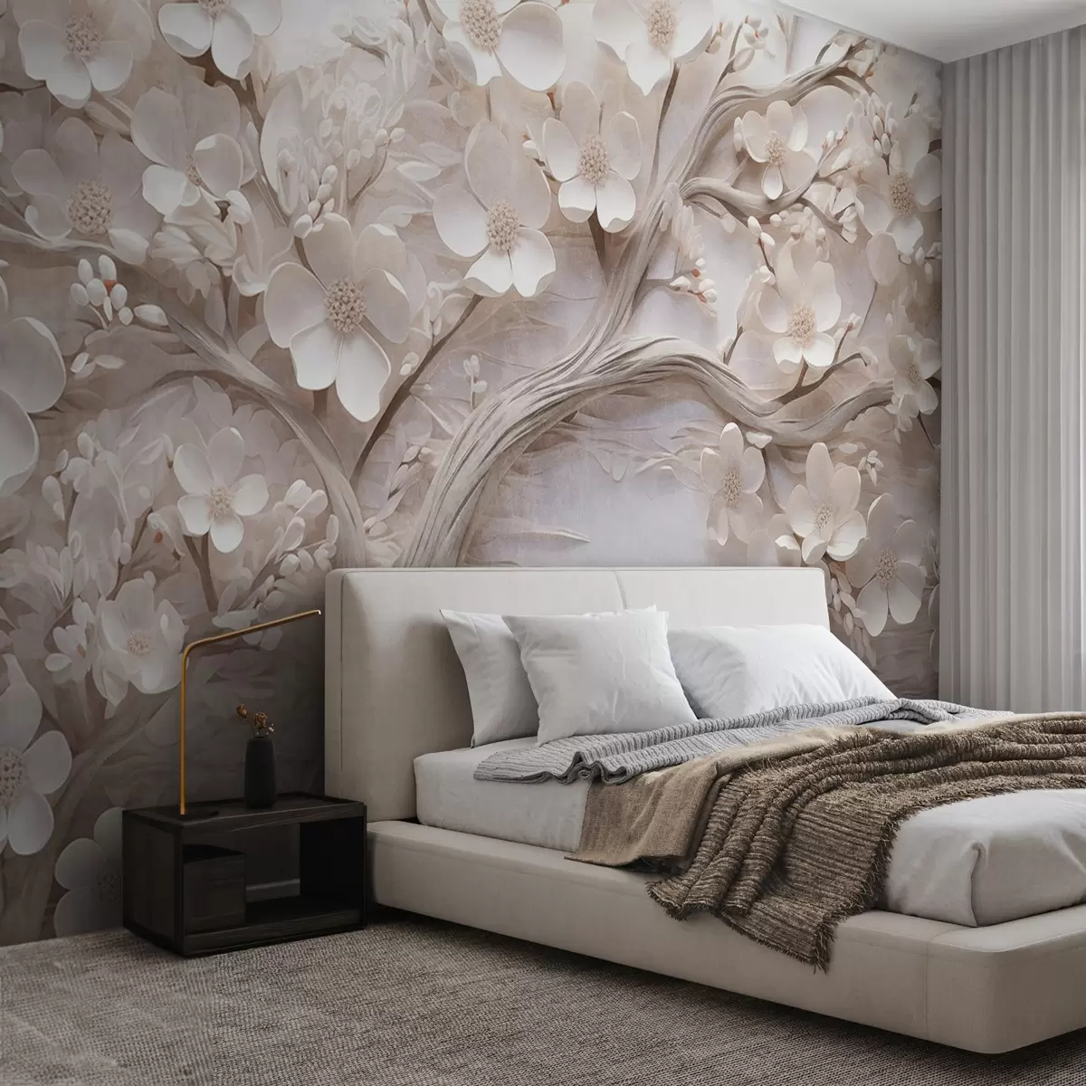 Fototapeten Strukturierter Baum mit weißen Blüten und einem braunen Stamm, der Hintergrund ist weiß mit horizontalen Linien weiche Beleuchtung N° w09166