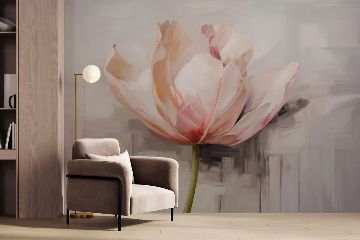 Fototapeten Rosa Tulpe, Ölgemälde Nachahmung mit weichen Pinselstrichen, abstrakten Hintergrund mit Pastell Schattierungen von Grau und Beige N° w09187