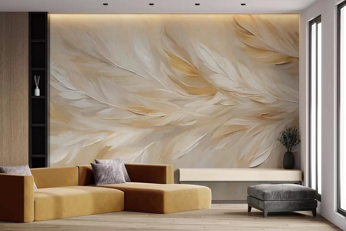 Fototapeten Weiße und beige Federn in einem fließenden Druck angeordnet, weiche Textur, warme Farbpalette, abstrakter Hintergrund N° w09191