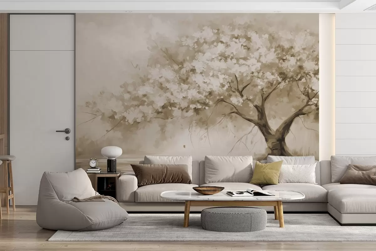 Fototapeten Abstrakter beigefarbener Blütenbaum in voller Blüte, neben einem Fluss, weiche, strukturierte Pinselstriche und Pastellfarben N° w09193v1