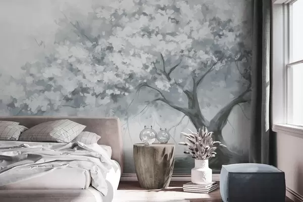 Fototapeten Abstrakter gedämpfter blauer Blütenbaum in voller Blüte, neben einem Fluss, weiche strukturierte Pinselstriche und Pastellfarben N° w09193v2