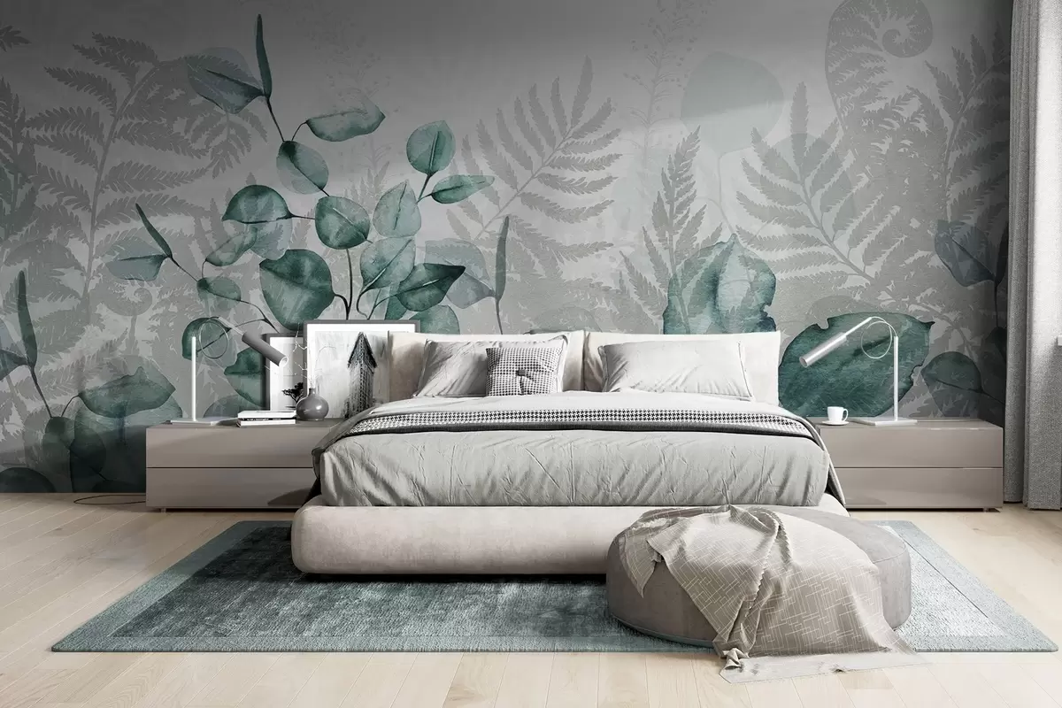 Fototapeten Eukalyptus und Farnblätter in Grün- und Grautönen, Aquarelleffekt, botanische Illustration N° w09197