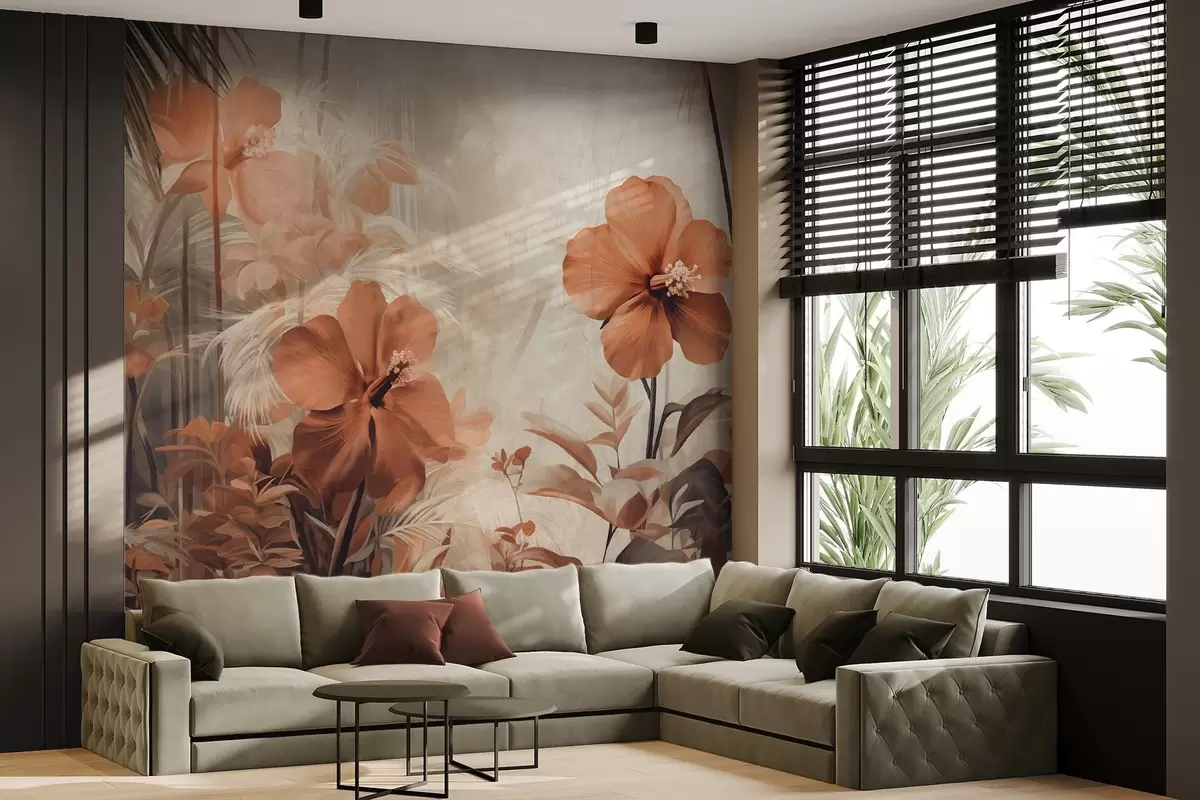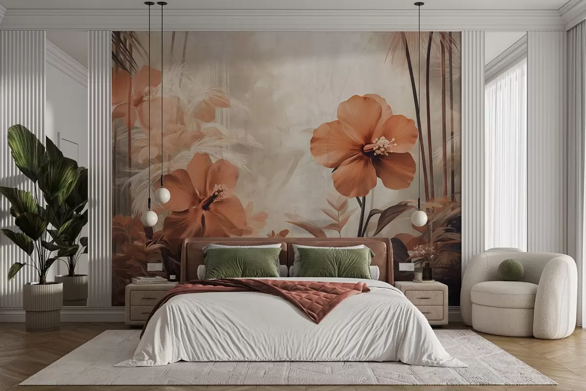 Fototapeten Pastellrote Hibiskusblüten mit Blättern und Stängeln, tropische Vegetation, weiche, gedeckte Farben, Vintage-Stil N° w09203