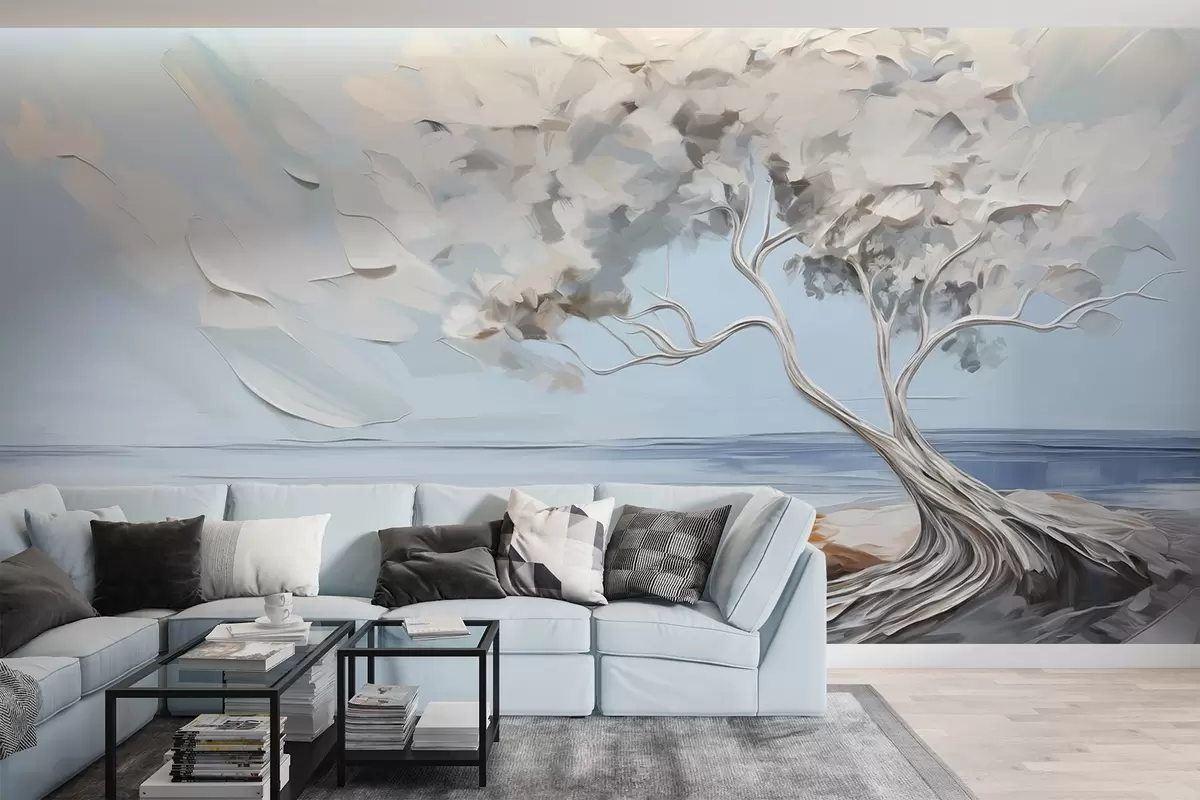 Fototapeten Ein weißer Baum mit dicken und strukturierten Blättern an einem Sandstrand, Landschaft mit einem hellblauen Himmel N° w09205