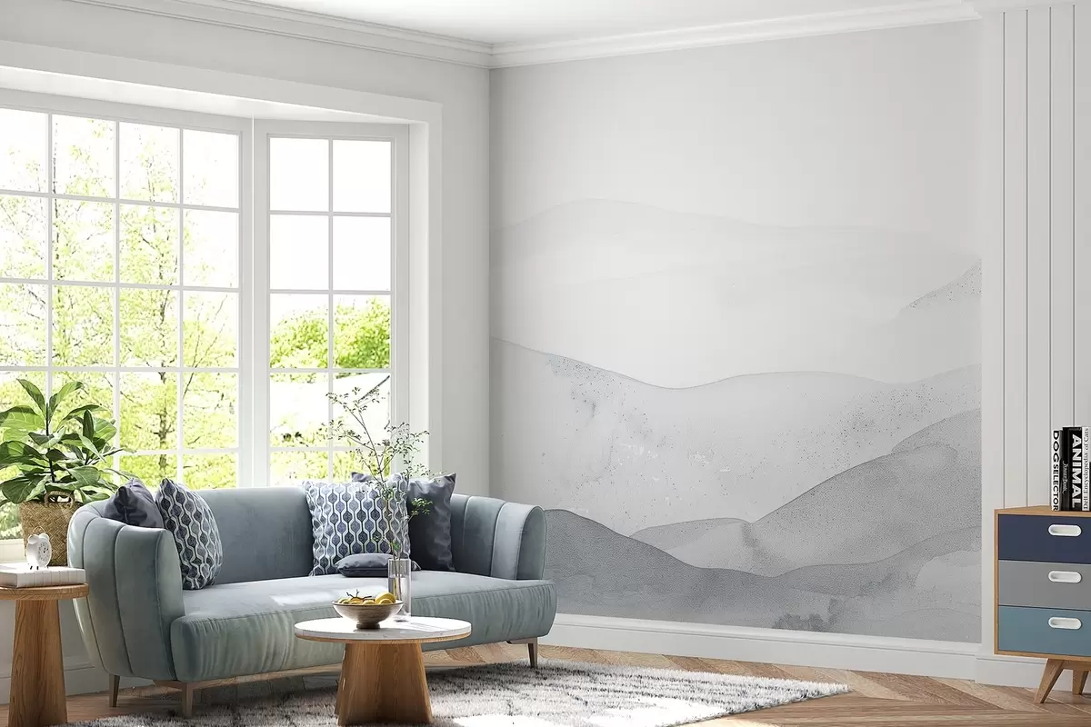 Fototapeten Minimalistische neblige Berge in sanften Blautönen N° w09223v2