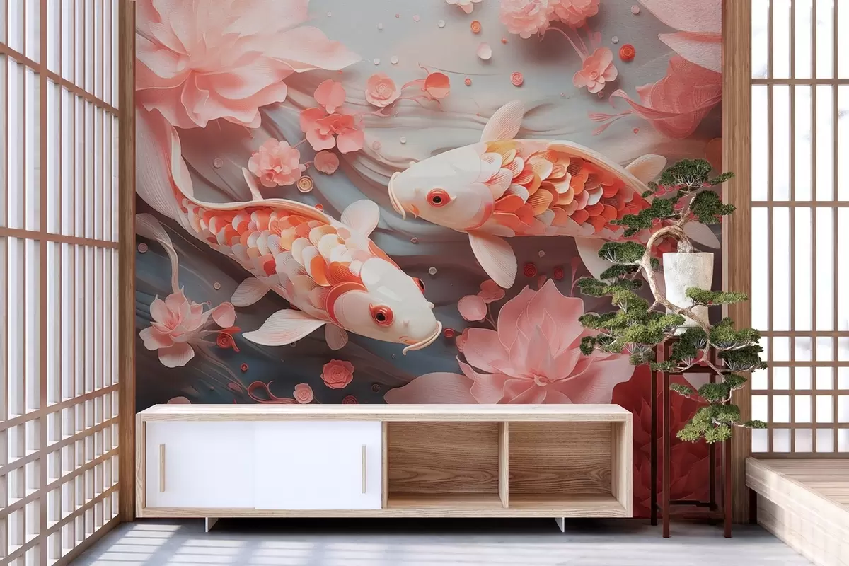 Fototapeten Zarte Fische mit dimensionalen Schuppen schwimmen durch einen Fluss von Blütenblättern und zarten Rosatönen N° w09237