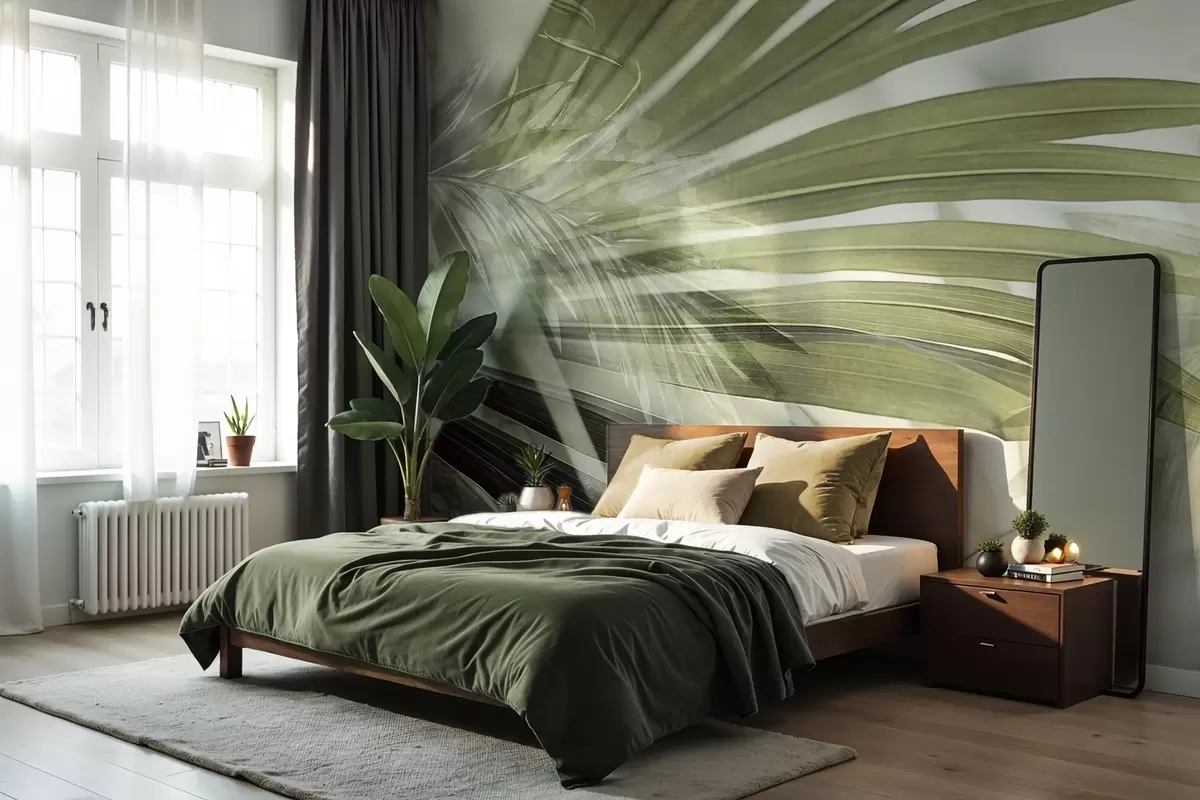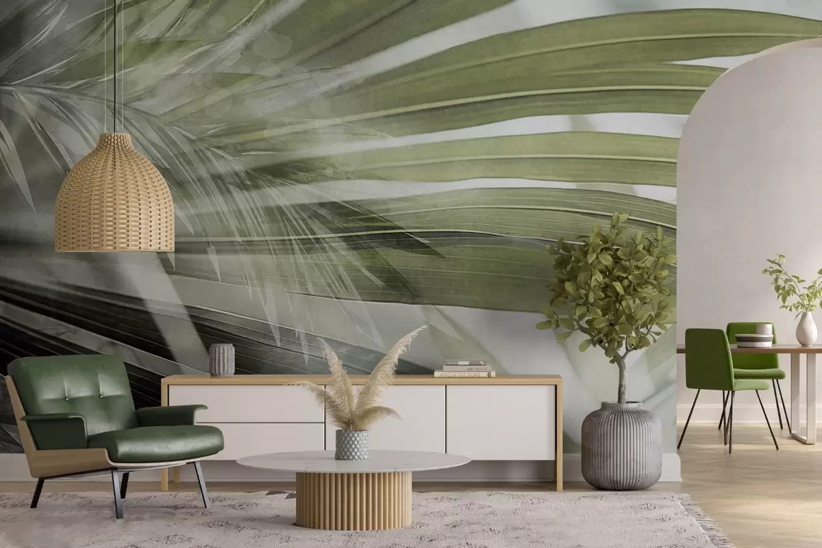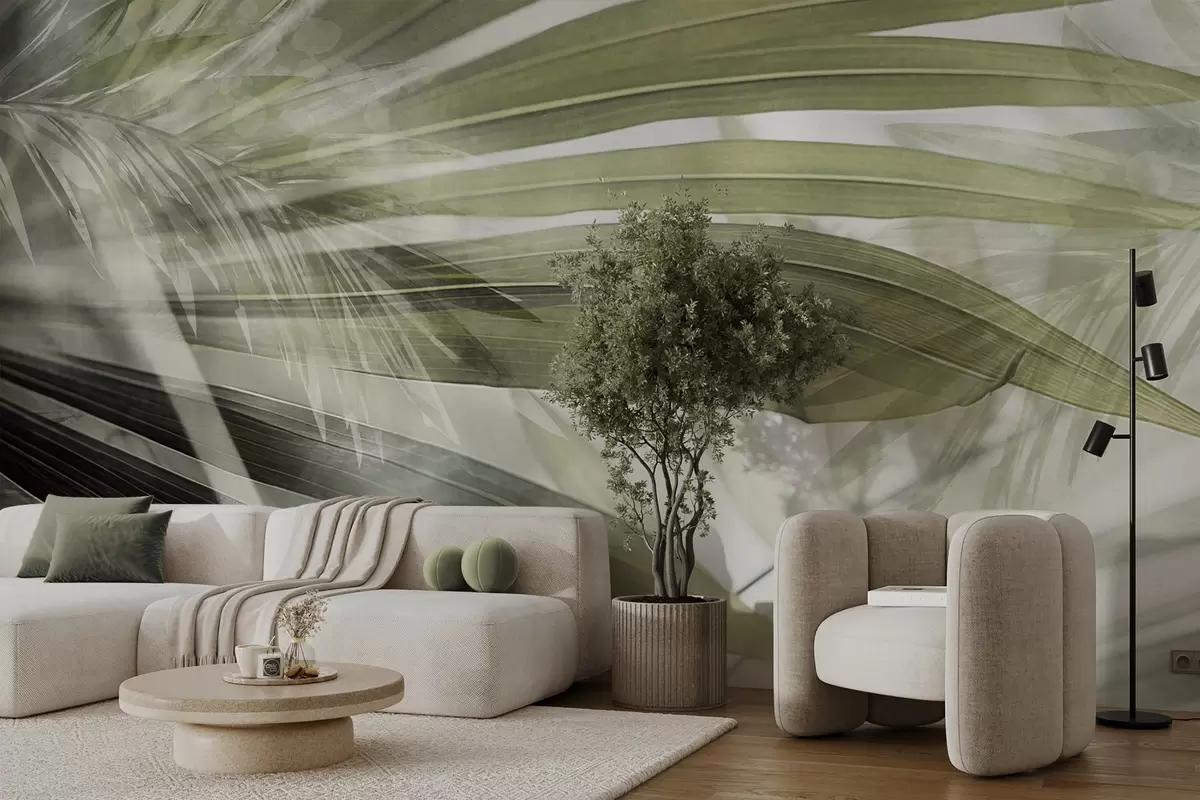 Fototapeten Palmenblätter mit einem hellgrünen Farbton, die sich überlappen und einen Schichteffekt erzeugen, vor einem weichen, neutralen Hintergrund N° w09256v1
