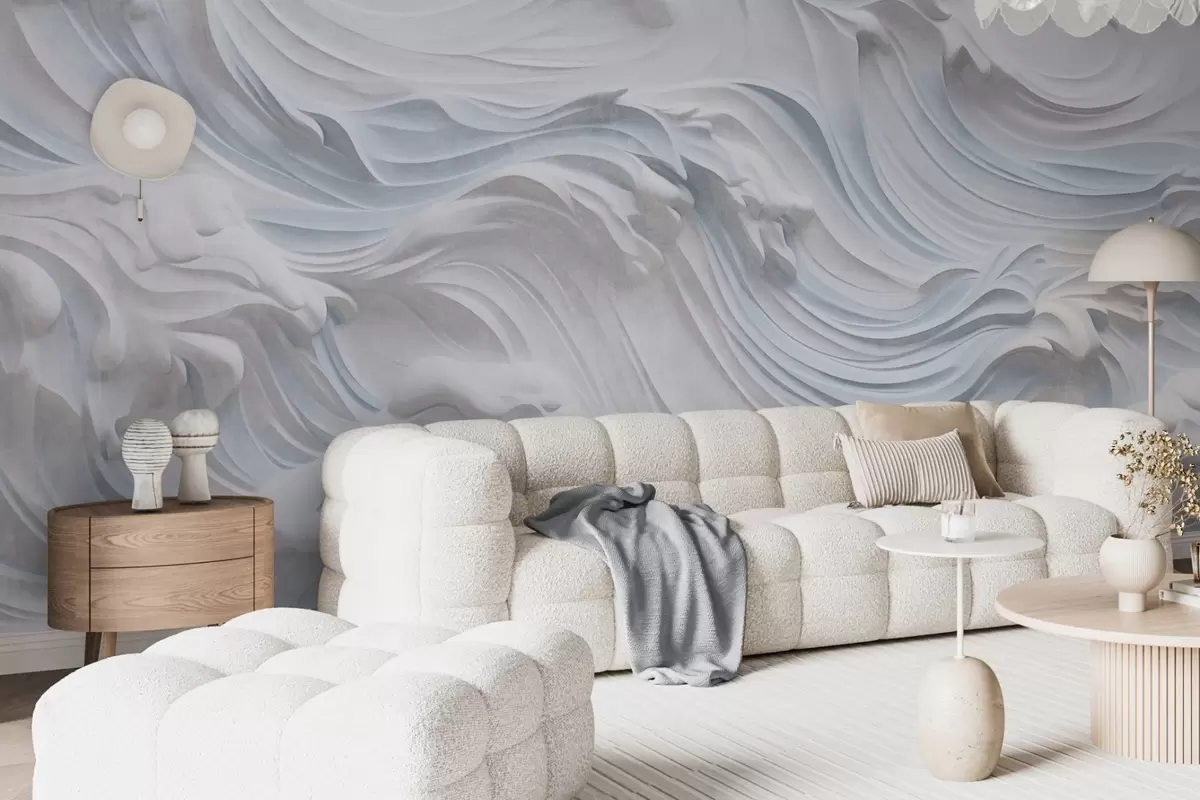 Fototapeten Weiß und hellblau strukturierte abstrakte Meereswellen mit Schaum, die von links nach rechts fließen, dynamischer und strukturierter Druck N° w09266