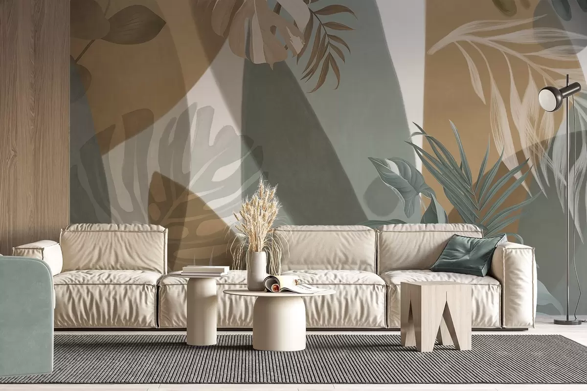 Fototapeten Monstera Blätter und Palmenblätter in einem Muster mit braunen, weißen und grünen Farben, tropische Stimmung, abstrakte Formen, dekorativ N° w09288