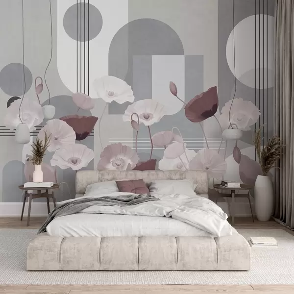 Fototapeten Mohnblumen in weißen und grauen Farben mit geometrischen Formen im Hintergrund, Kreise und Bögen, minimalistischer Stil, weiche Farben N° w09289v1