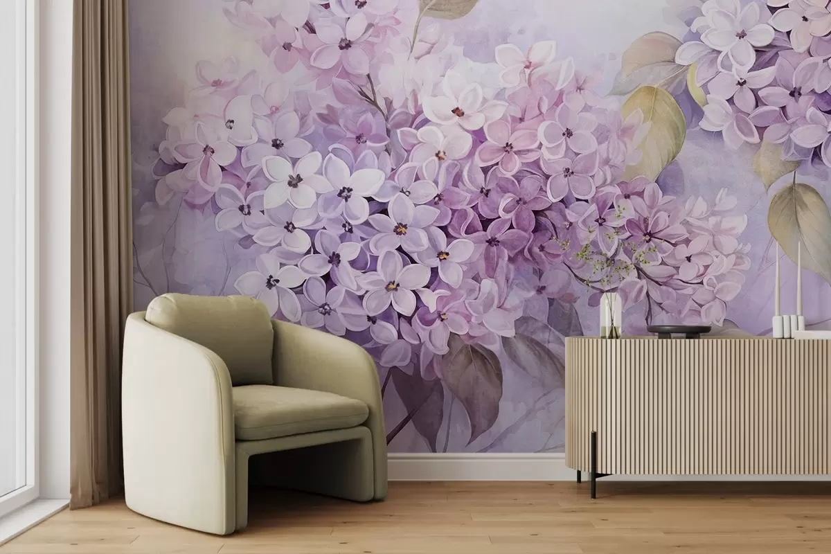 Fototapeten Lila strukturierte Blumen mit hellvioletten Blütenblättern, hellgrüne Blätter, Aquarellstil, weiche, pastellige Farben, zarte Pinselstriche N° w09291