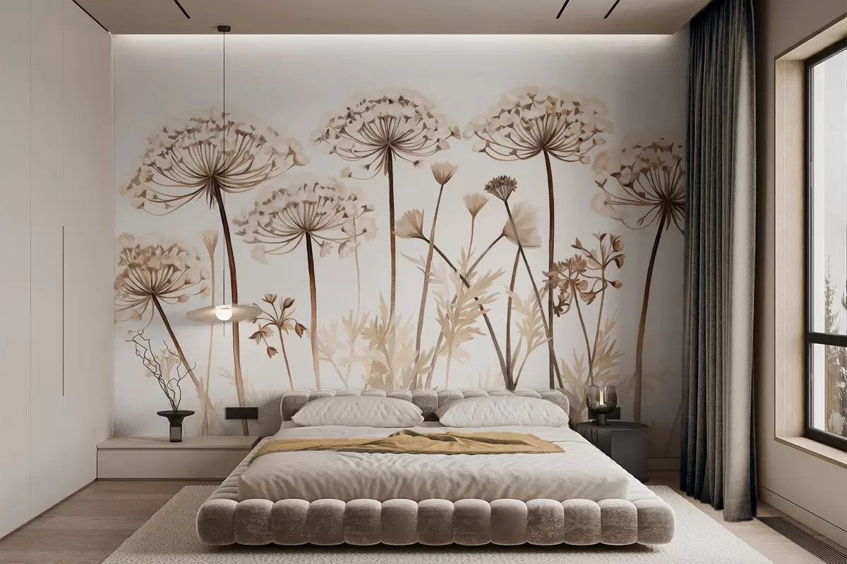 Fototapeten Queen Anne's Lace Blumen in einem Feld, texturierte Malerei Nachahmung, braun, beige und weiß Farbpalette, botanische Illustration N° w09294