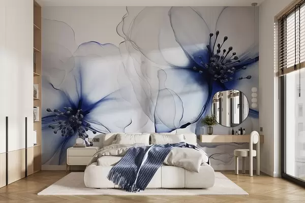 Fototapeten Zwei durchscheinende, strukturierte blaue Blüten mit sichtbaren Staubgefäßen, sich überlappenden zarten Blütenblättern und einer weich fließenden Textur N° w09295v1