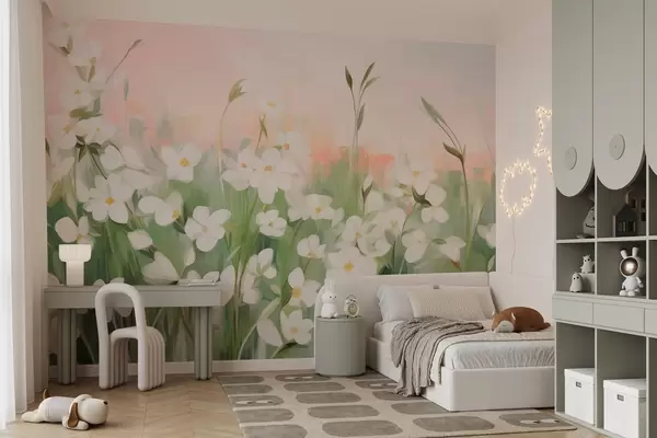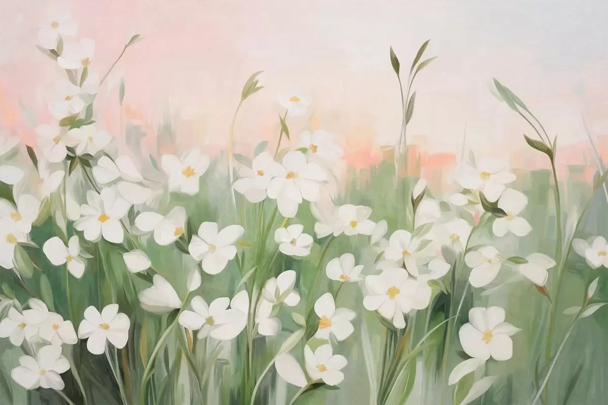 Fototapeten Abstraktes Feld mit Wildblumen mit grünen Stielen und Blättern vor einem zartrosa und weiß strukturierten Himmel N° w09297