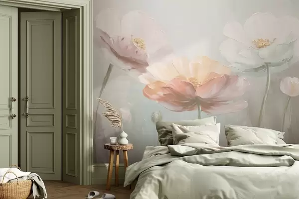 Fototapeten Volumetrische Pastellmohnblumen im Stil der Ölmalerei N° w09310v1