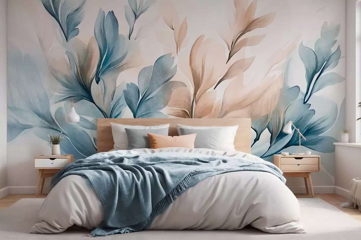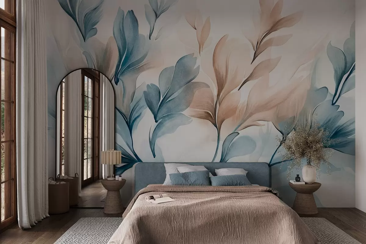 Fototapeten Blaue und braune abstrakte Blätter mit sichtbaren Pinselstrichen, leicht und texturiert, weiche Farbpalette, Aquarelleffekt N° w09313