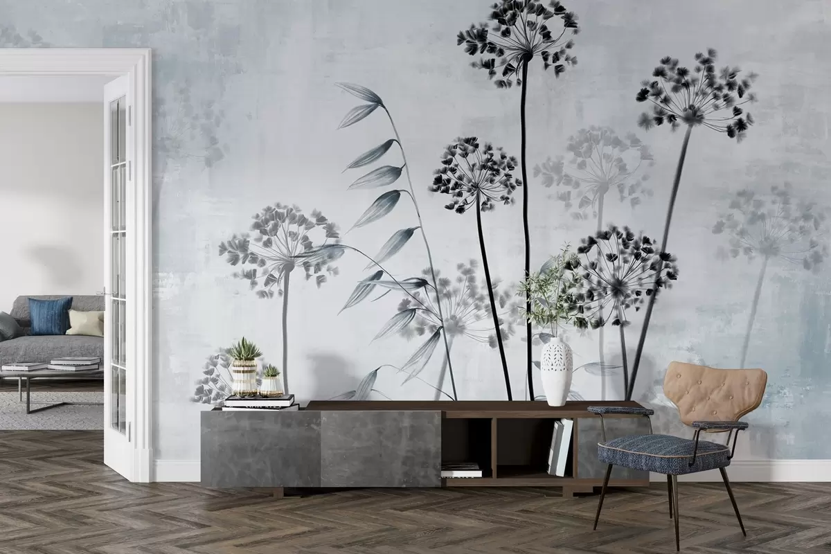 Fototapeten Getrocknete Blumen Zeichnung mit langen Stielen, monochrome Palette, vor einem strukturierten, hellgrauen Hintergrund, botanische Illustration N° w09314