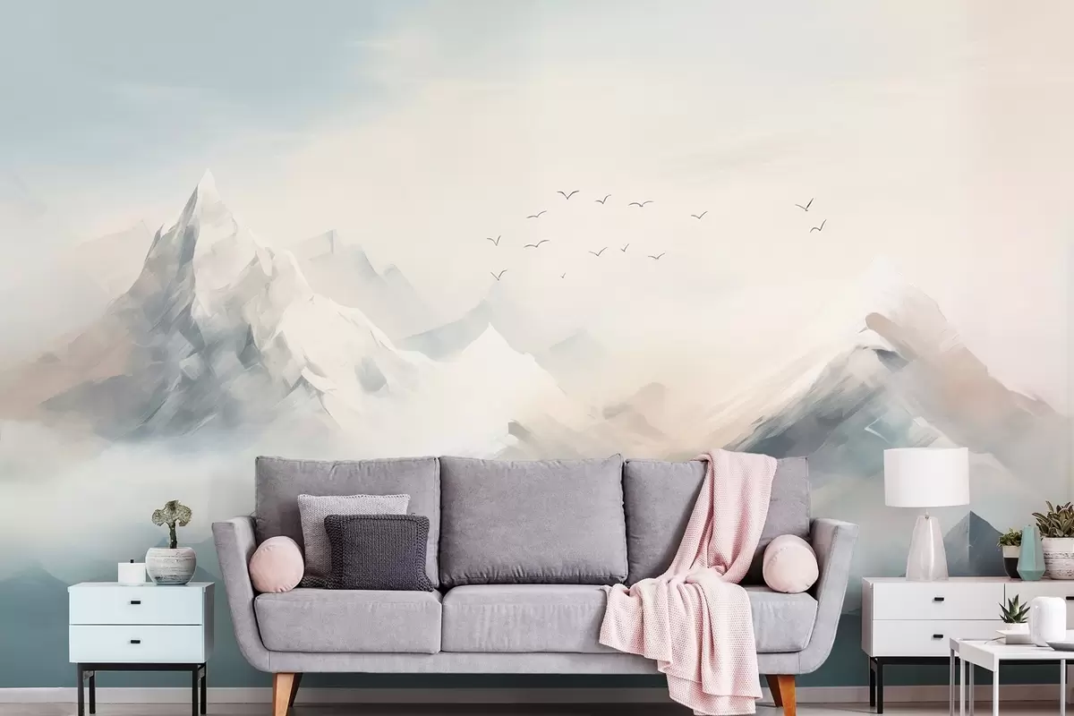 Fototapeten Schneebedeckte Berggipfel im Morgennebel mit auffliegenden Vögeln N° w09326