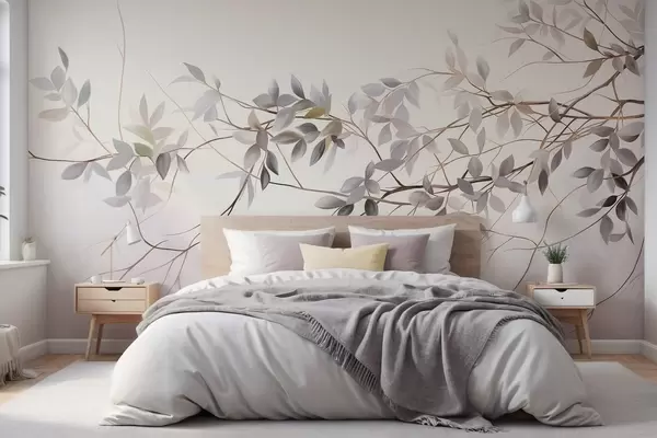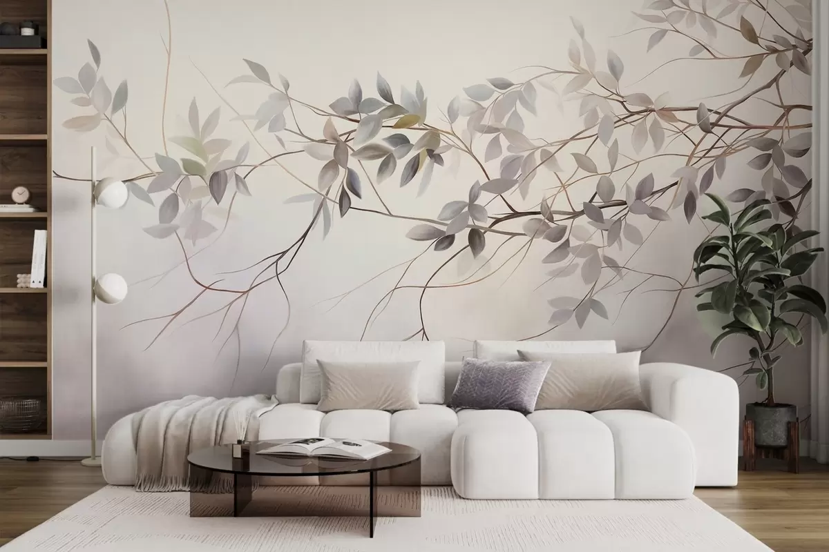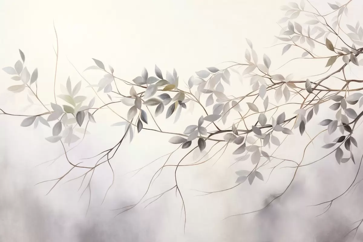 Fototapeten Zarte, strukturierte Zweige mit gedeckten grauen, violetten und grünen Blättern vor einem weichen, verschwommenen Hintergrund N° w09336