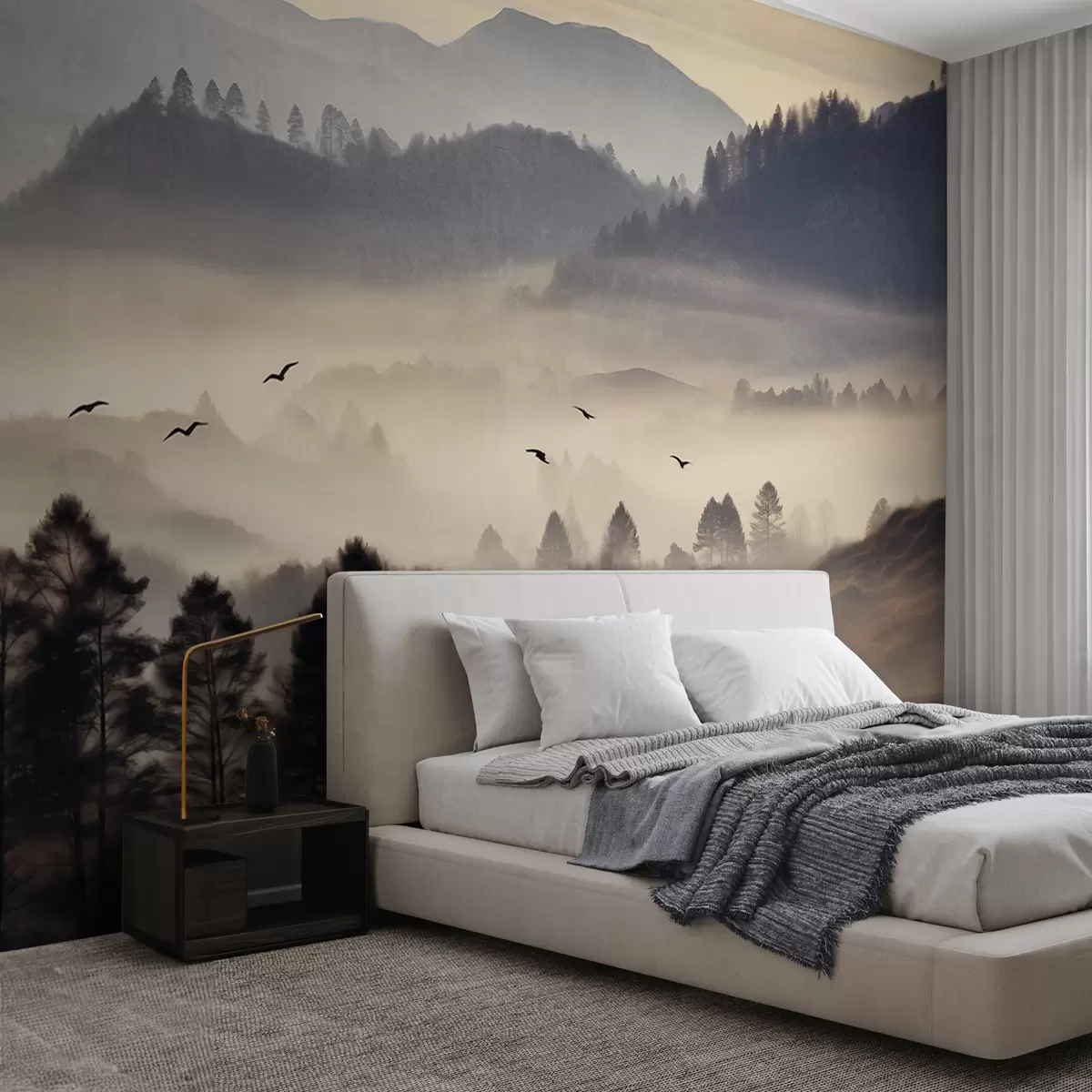 Fototapeten Strukturierte Berglandschaft mit Nebelschichten, silhouettierte Bäume im Vordergrund, entfernte Bergkette, weiche Beleuchtung N° w09338