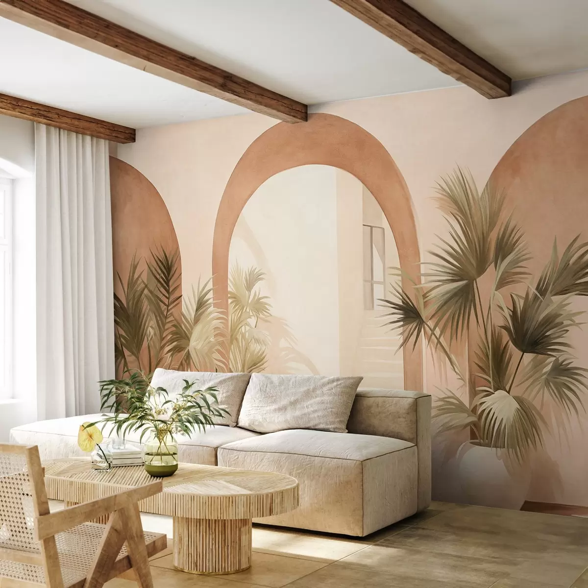 Fototapeten Strukturierte Bögen mit Topfpflanzen, hellbeige Farbpalette, minimalistisches Design, Treppenhaus im Hintergrund N° w09339