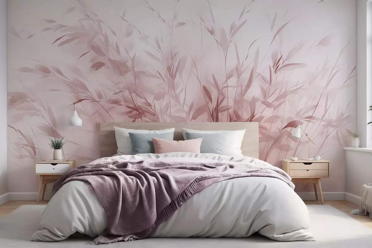 Fototapeten Gras und Unkraut mit dünnen Blättern und Stängeln, hellrosa Farben, weiche und zarte Pinselstriche, minimalistischer Druck N° w09342v2