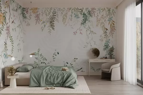 Fototapeten Botanische Illustration mit Farnen, Gras und hängenden Pflanzen, Pastelltöne, auf weißem Hintergrund Aquarell strukturierten Stil N° w09364