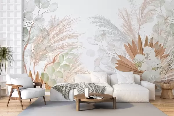 Fototapeten Pampasgras, Eukalyptus, tropische Blätter und Orchideen vor weißem Hintergrund, Pastellfarben N° w09366