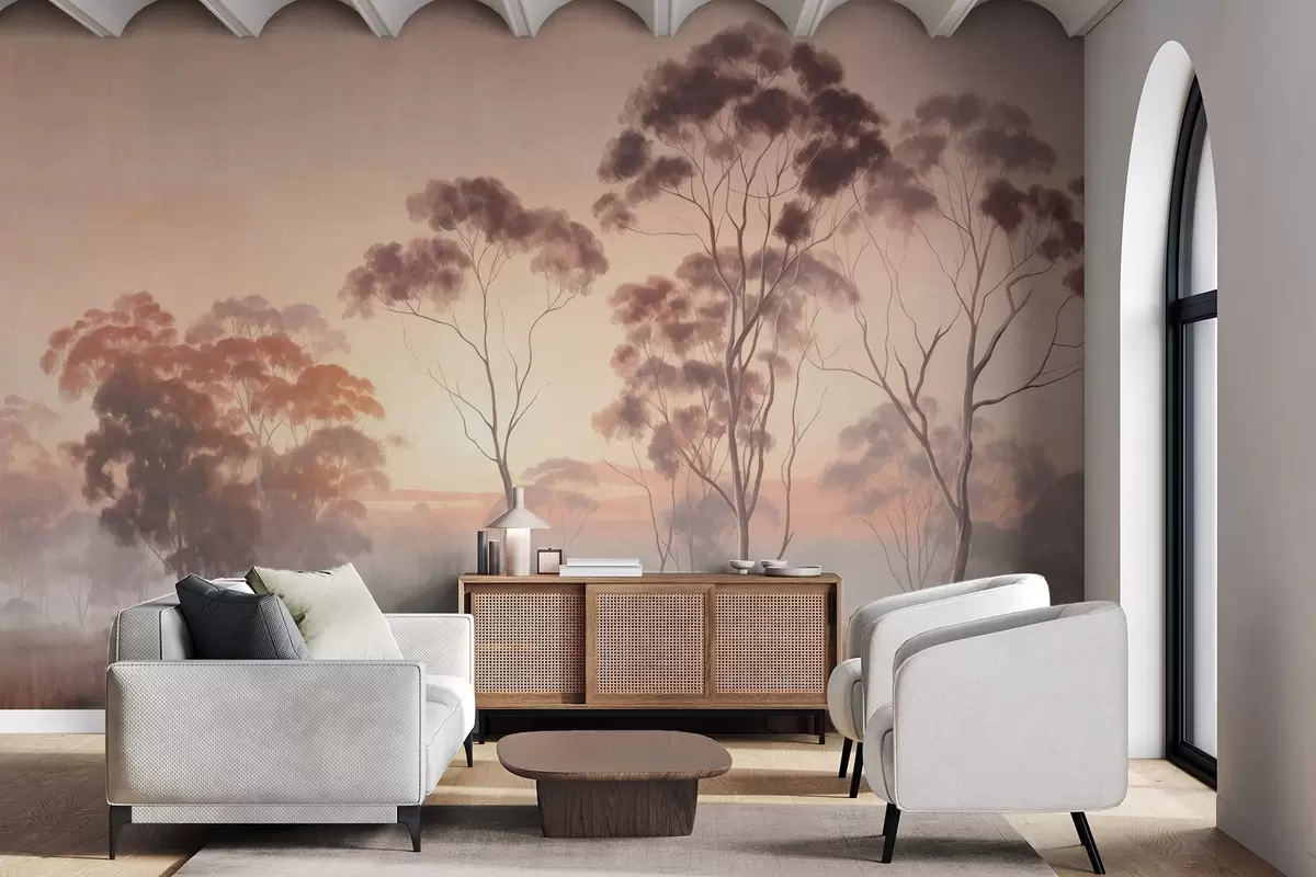 Fototapeten Eine Landschaft mit Eukalyptusbäumen in einem Feld mit Pastell rosa und orange Himmel, ein leichter Nebel, Malerei texturierten Stil N° w09367