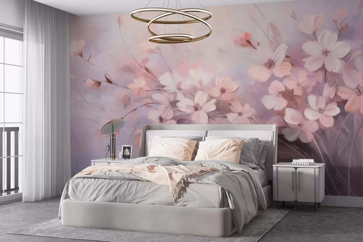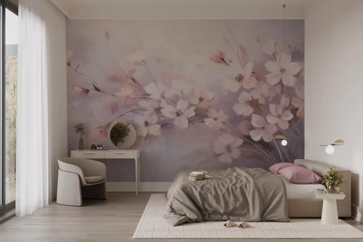 Fototapeten Ein Blumenarrangement mit zarten Blumen mit weichen, verschwommenen Rändern vor einem pastellfarbenen Hintergrund aus Lavendel und hellen Rosatönen N° w09369