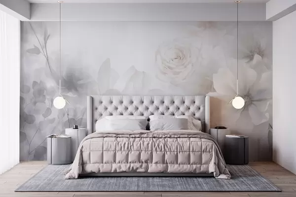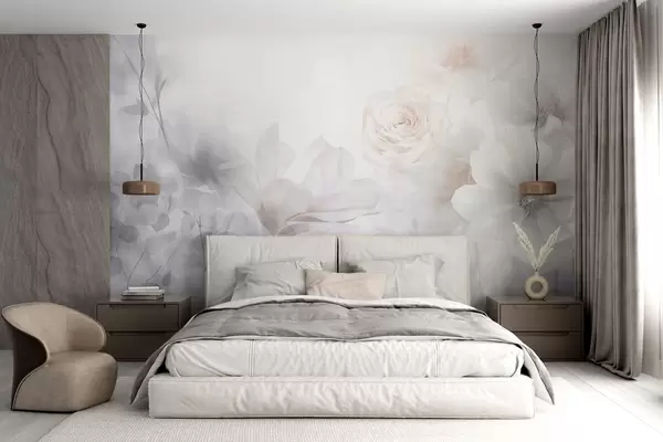 Fototapeten Ein zartes abstraktes Blumenarrangement mit pastellrosa Rosen und Magnolien, Weichzeichner, hellgrauer Hintergrund N° w09371