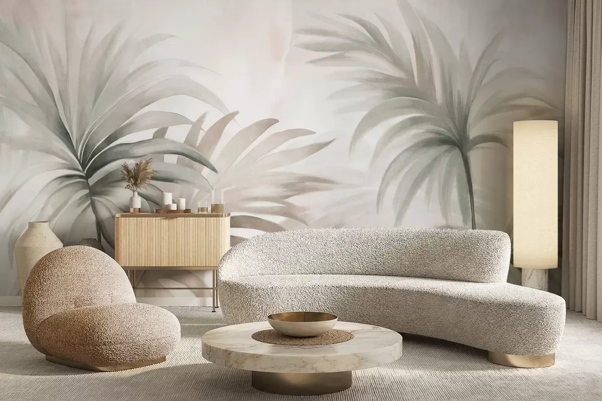 Fototapeten Palme strukturierte Blätter in neutralen Farben, beige abstrakten Hintergrund, weiche Pinselstriche, tropischen strukturierten Laub N° w09380