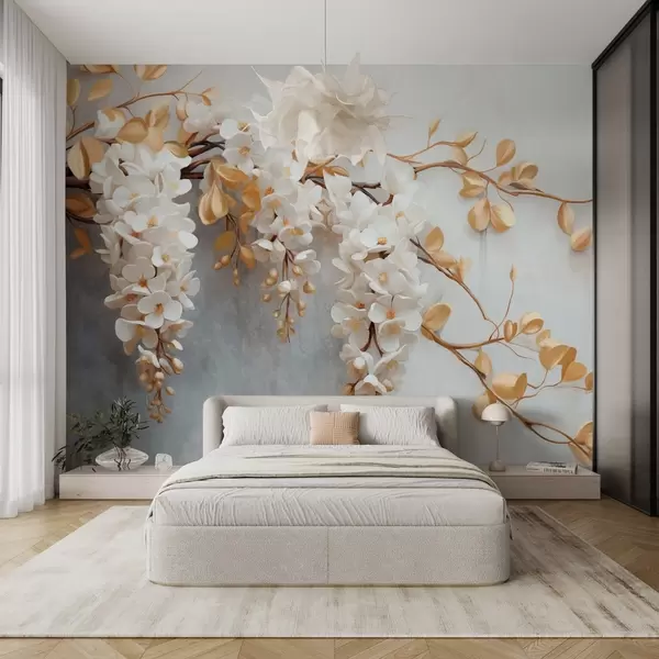 Fototapeten Weiße Glyzinienblüten mit gelben Blättern auf einem Zweig, die kaskadenartig vor einem strukturierten weißen Hintergrund herabfallen, zarte Blütenblätter N° w09381