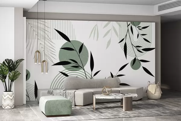 Fototapeten Abstrakter Strukturdruck mit geometrischen Formen, Kreisen und Bögen sowie schwarzen und grünen Pflanzen auf weißem Hintergrund N° w09384