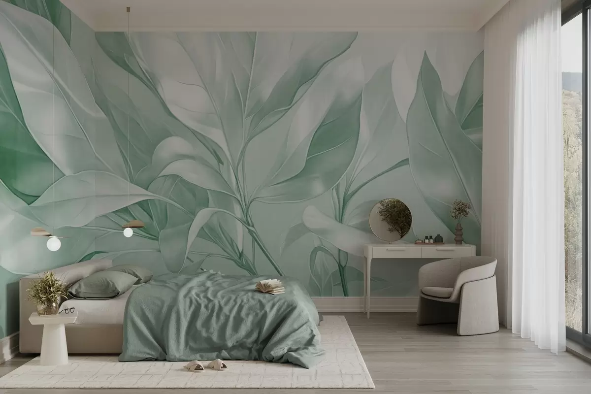 Fototapeten Magnolienblätter mit weißen und grünen Farbtönen, weiche Beleuchtung, elegante Komposition, detaillierte Blattadern, künstlerische Pinselstriche N° w09385v1
