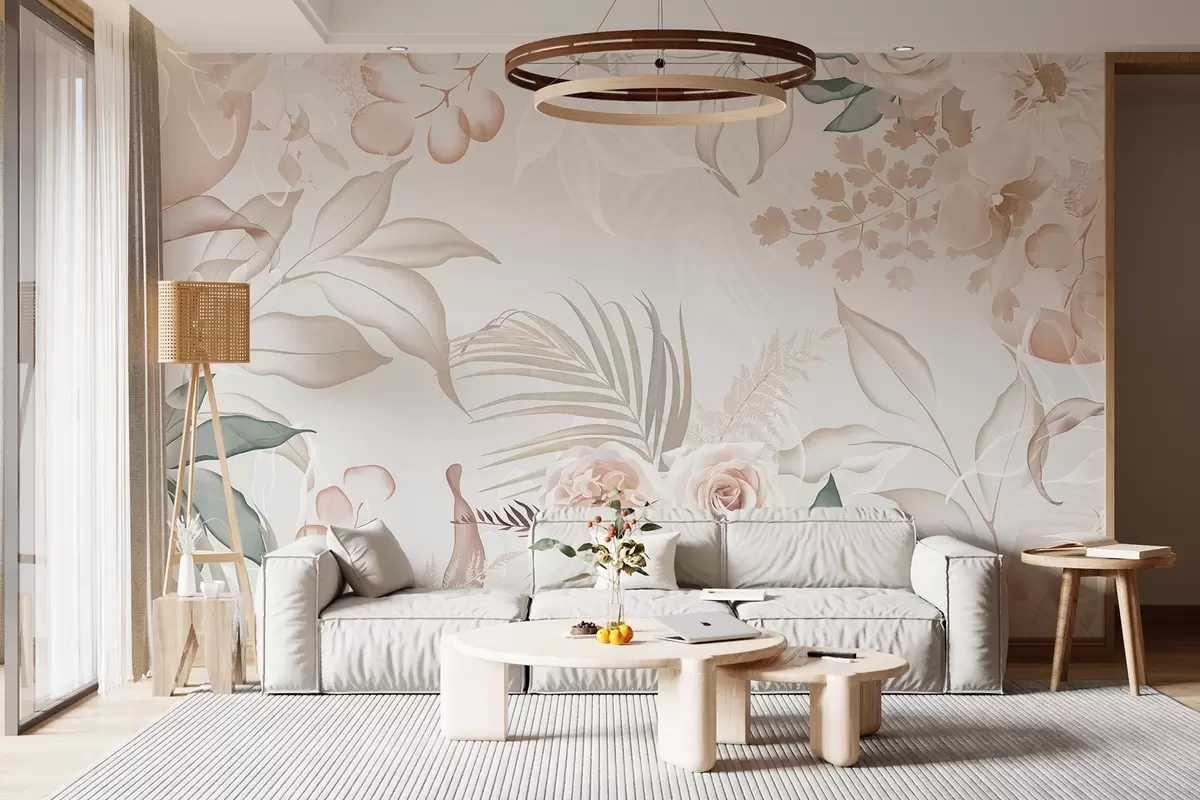 Fototapeten Blumenarrangement mit Rosen, Orchideen, Eukalyptus und Palmblättern in Pastellfarben, beigefarbenem Hintergrund N° w09393