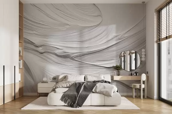 Fototapeten Abstrakte, strukturierte weiße Farbstriche in Anlehnung an ein wirbelndes Muster, neutrale, minimalistische, moderne Komposition N° w09394