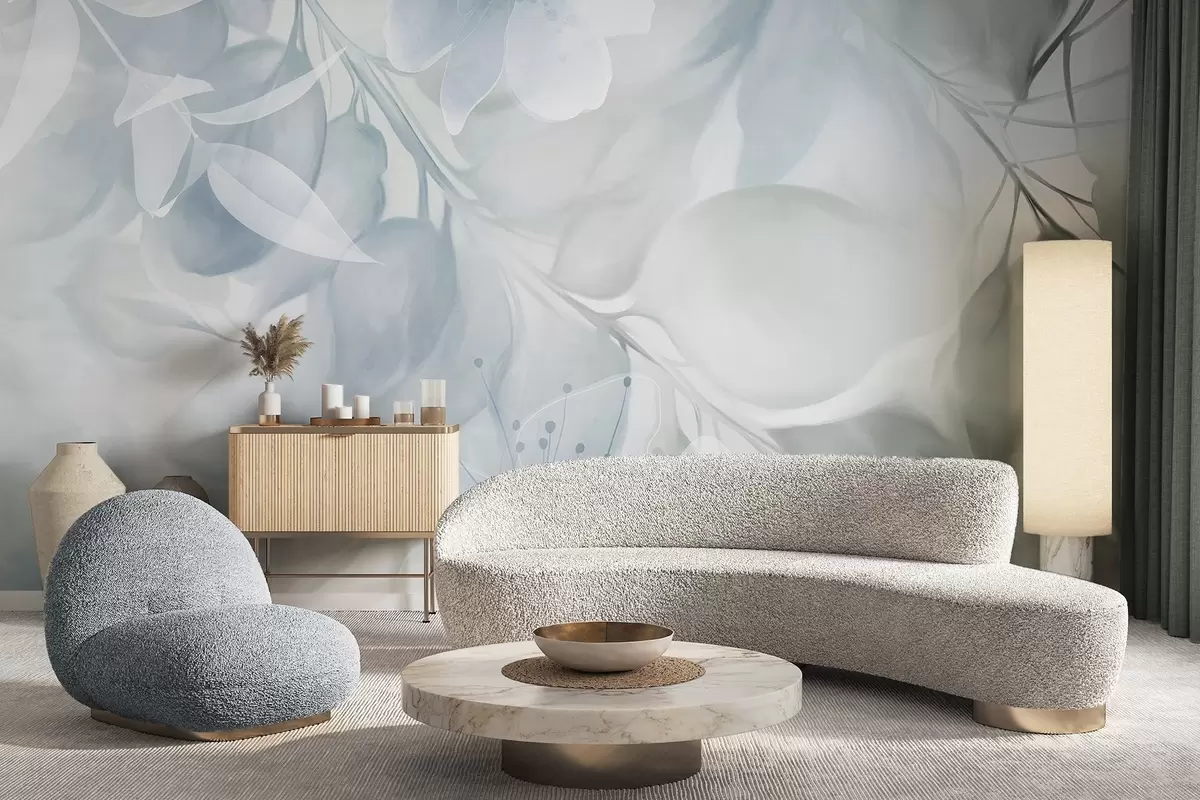 Fototapeten Blumenkunst mit gedeckten blauen und grünen Blumen, Blättern und Zweigen, sanften Pastellfarben und Aquarell-Struktureffekt N° w09397v1