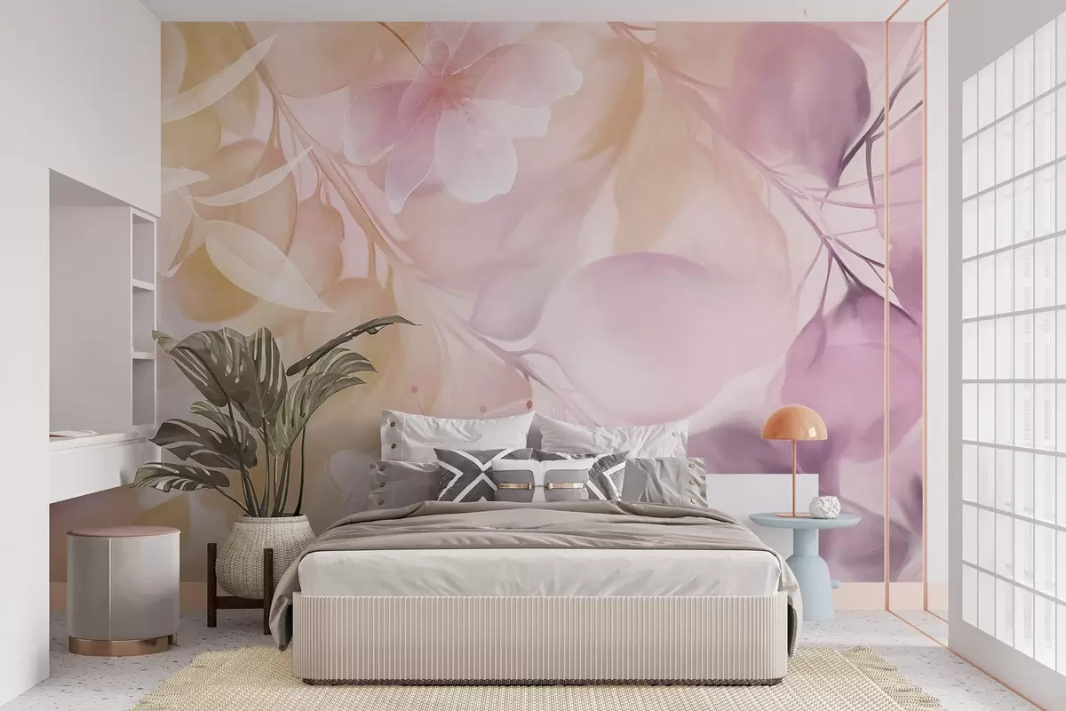 Fototapeten Blumenkunst mit gedeckten gelben und violetten Blüten, Blättern und Zweigen, sanften Pastellfarben und Aquarell-Struktureffekt N° w09397v2