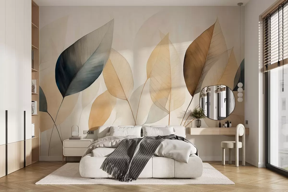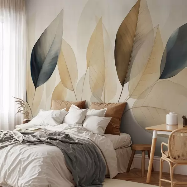 Fototapeten Strukturierte Malerei, die Blätter in Braun-, Gelb- und Grautönen mit zarten Adern und Stielen imitiert N° w09400