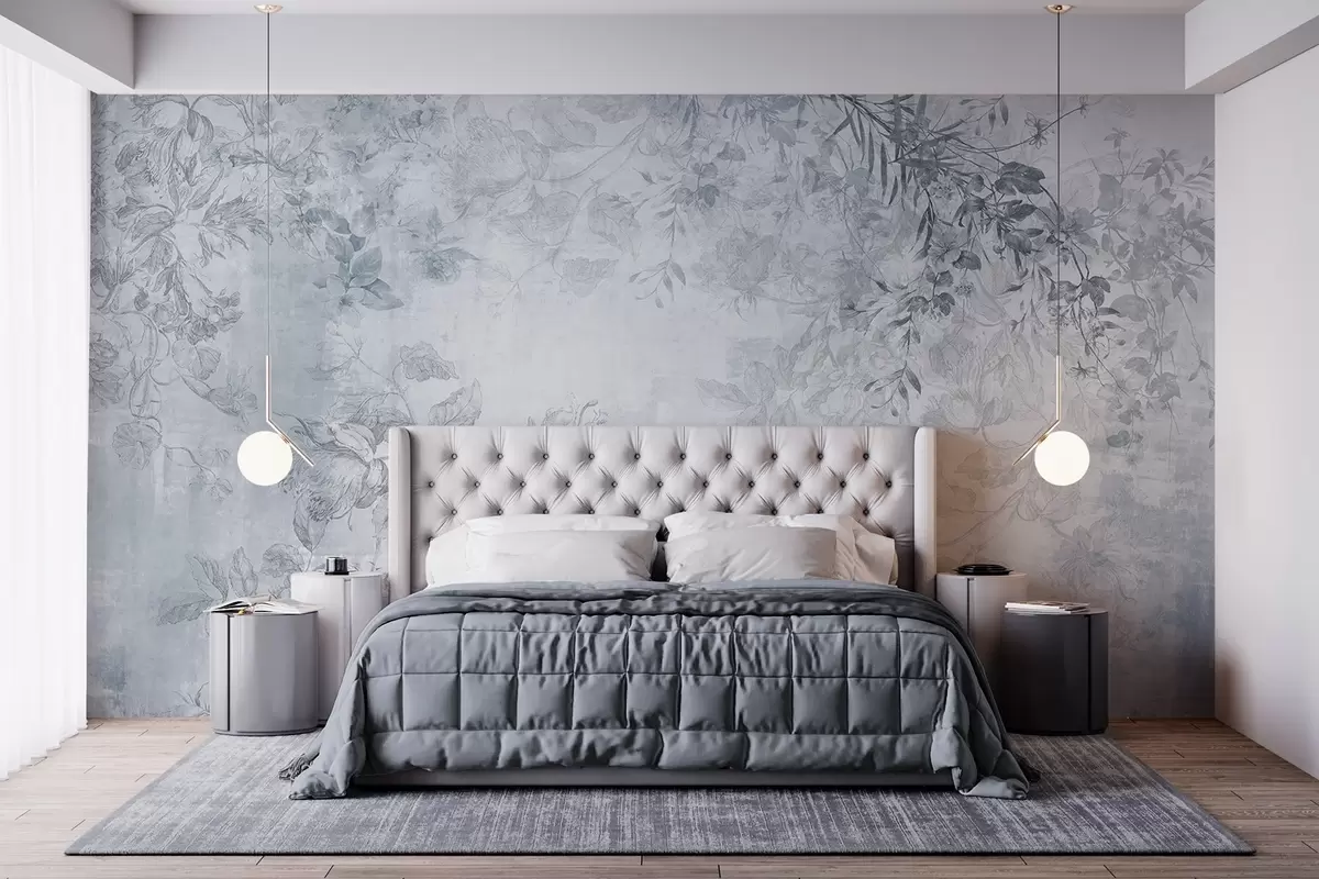 Fototapeten Vintage-Blumenkunst mit strukturierter Textur, Illustrationen von zarten Gartenblumen und Blättern im Zeichenstil, sanfte Blautöne N° w09402v1