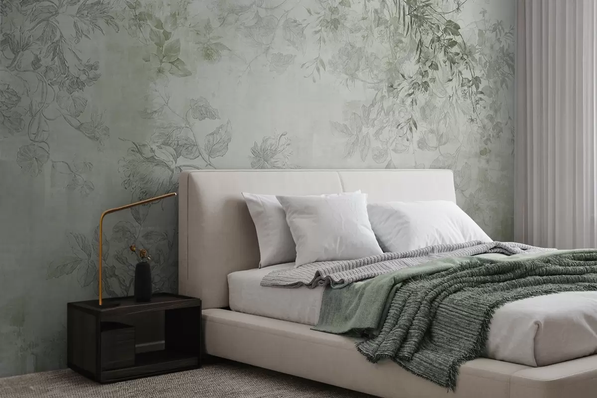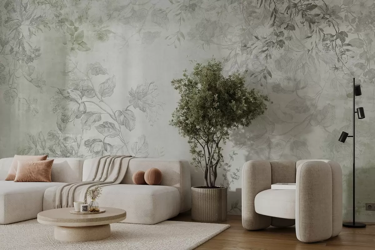 Fototapeten Vintage-Blumenkunst mit strukturierter Textur, Illustrationen von zarten Gartenblumen und Blättern im Zeichenstil, sanfte Grüntöne N° w09402v2