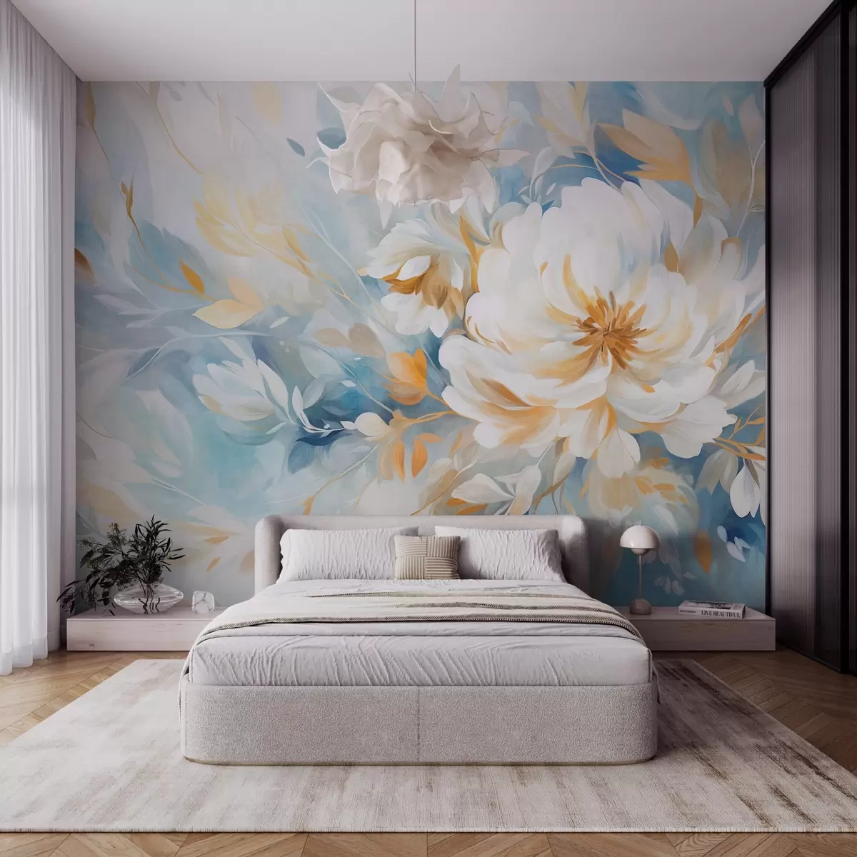 Fototapeten Strukturierte weiße Blume mit blauen und gelben Details und Blättern auf einem blau-weißen abstrakten Hintergrund, Malstil N° w09403