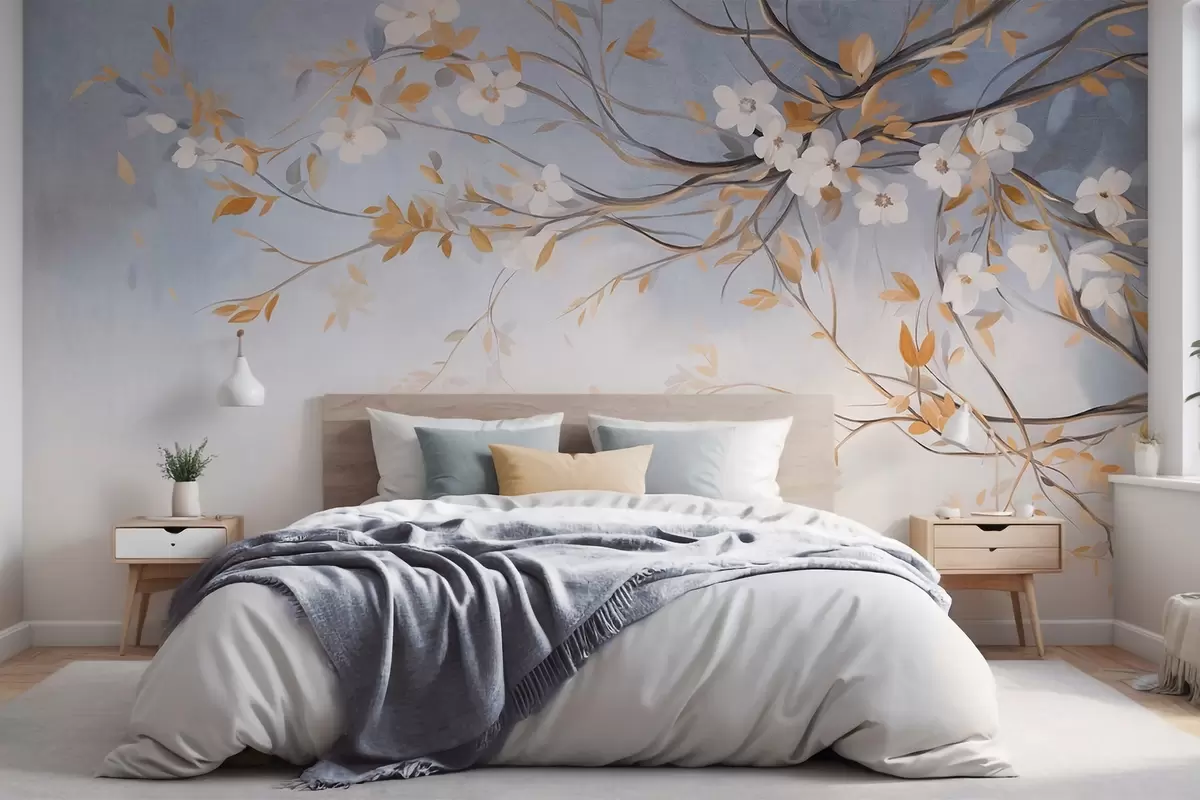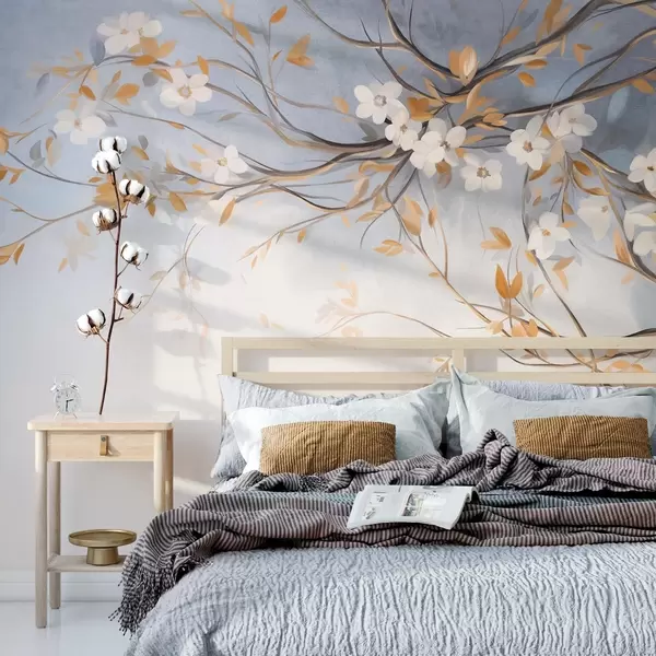 Fototapeten Weiße Blüten mit orangefarbenen Blättern auf einem Ast, hellblauer strukturierter Hintergrund, zarte Pinselstriche N° w09415
